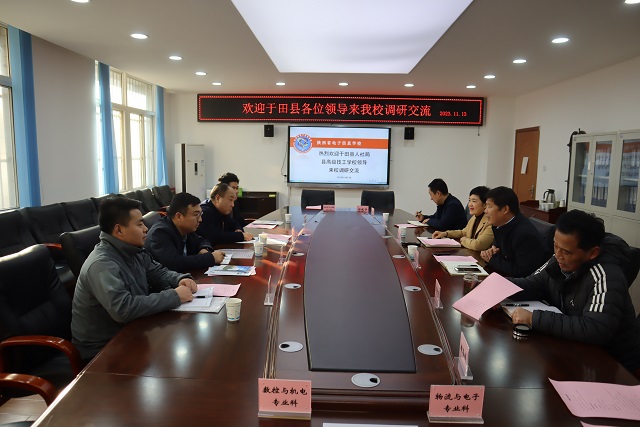 11月13日下午,新疆于田縣人社局局長、于田縣高級技工學校黨委書記何貴軍,陜西天益教育科技有限公司副總經理魏旬一行4人來我校調研交流。我校黨委書記顧學福、校長魏萍、副校長李孝勇、校長助理胡振彪和相關科室負責人出席交流會。