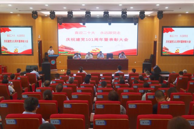 6月28日,“喜迎二十大 永遠跟黨走”慶祝建黨101周年暨表彰大會在我校綜合實訓樓五樓報告廳舉行,學校領導班子成員出席,全體教職工和部分離退休黨員參加。