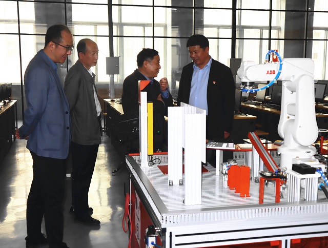 圖為楊建平校長一行參觀我校機(jī)器人實(shí)訓(xùn)基地