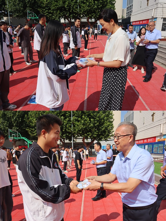 校長魏萍,副校長張中華為師生發放宣傳網絡安全知識書簽