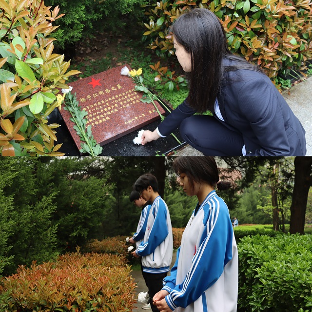 師生來到烈士墓區(qū),瞻仰墓碑,了解烈士生平事跡,為烈士們獻(xiàn)上親手制作的小白花,鞠躬致敬寄哀思。