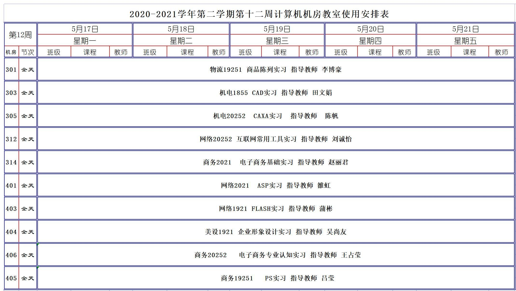 2020-2021學年第二學期第12周計算機機房教室使用安排表