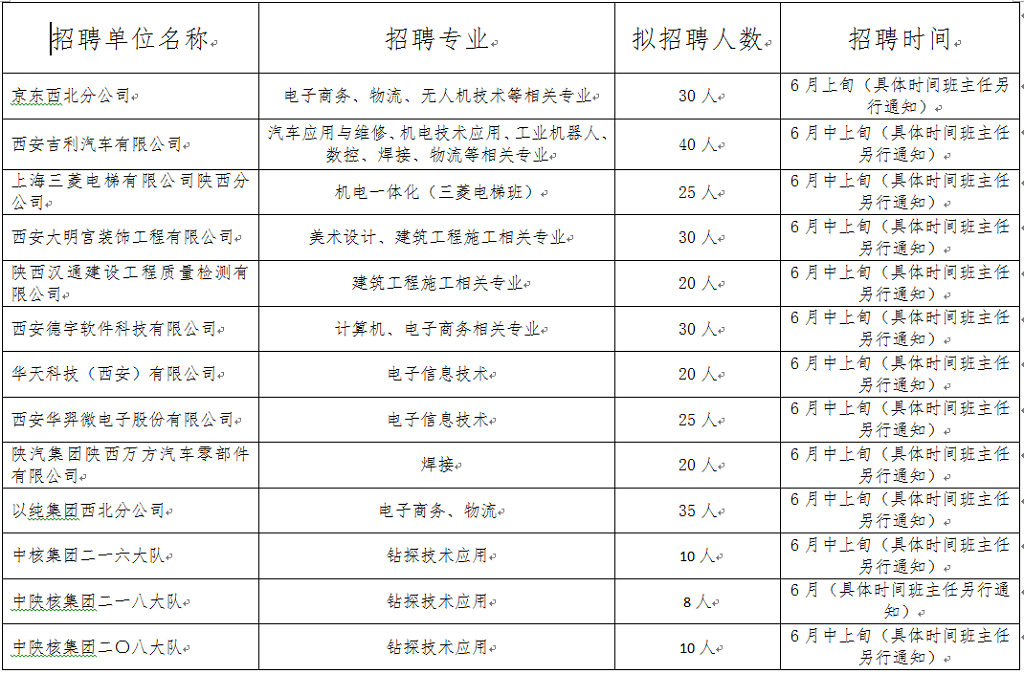 我校近期將全面開展2019級三年制各專業學生頂崗實習工作,現將各招聘單位、擬招聘人數、面試時間公布如下(見附表),請相關專業學生詳細了解各企業招聘簡章內容,認真準備。參加面試時,請做好個人防護,帶齊面試時所需的各種證件(所帶物品將通知班主任)。
