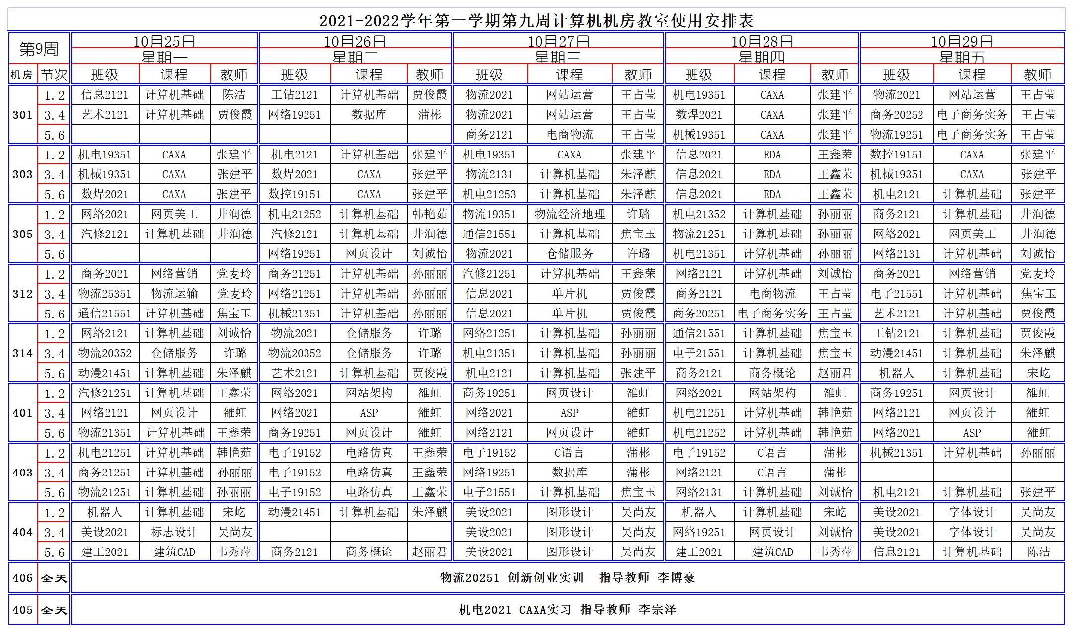 2021-2022學年第一學期第9周計算機機房教室使用安排表