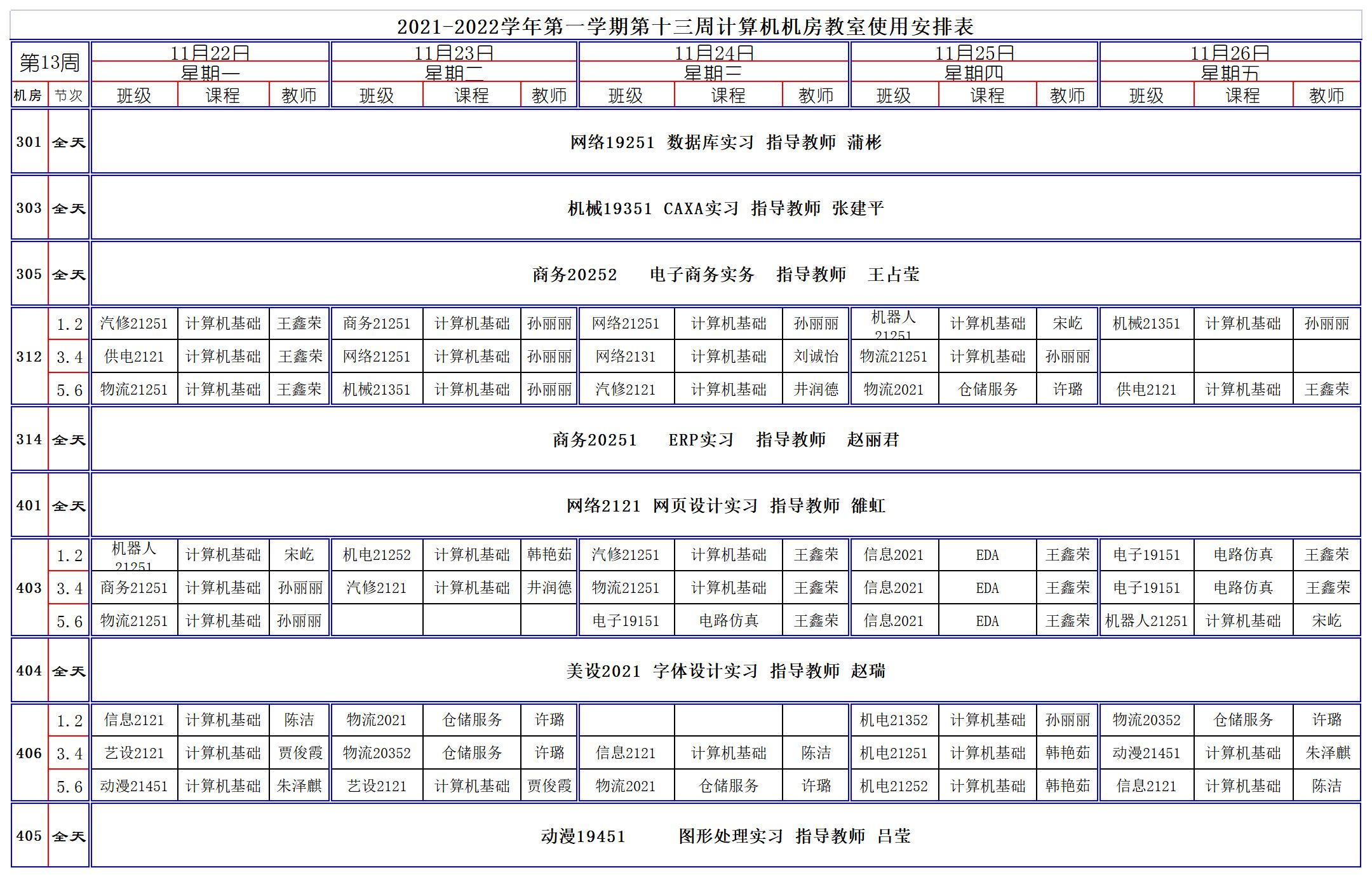 2021-2022學年第一學期第13周計算機機房教室使用安排表