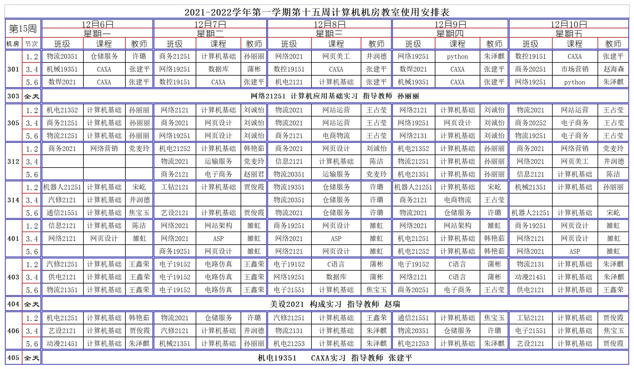 2021-2022學年第一學期第15周計算機機房教室使用安排表