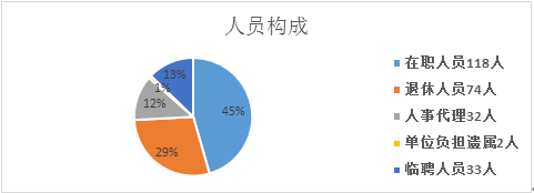截止2021年底,本單位在職人數(shù)118人,退休人員為74人。當(dāng)年變動情況:7人退休,1人辭職,離世3人;人事代理人員32人;臨聘33人;單位負(fù)擔(dān)的遺屬2人。