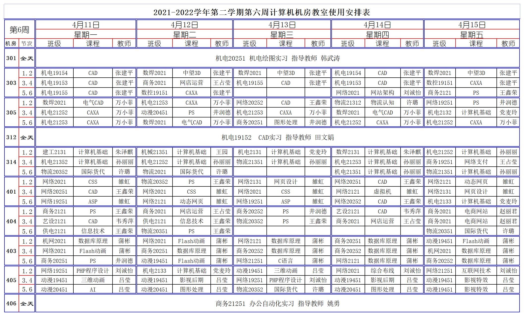 2021-2022學年第二學期第6周計算機機房教室使用安排表