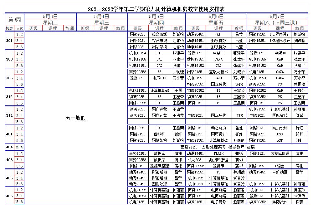 2021-2022學年第二學期第9周計算機機房教室使用安排表