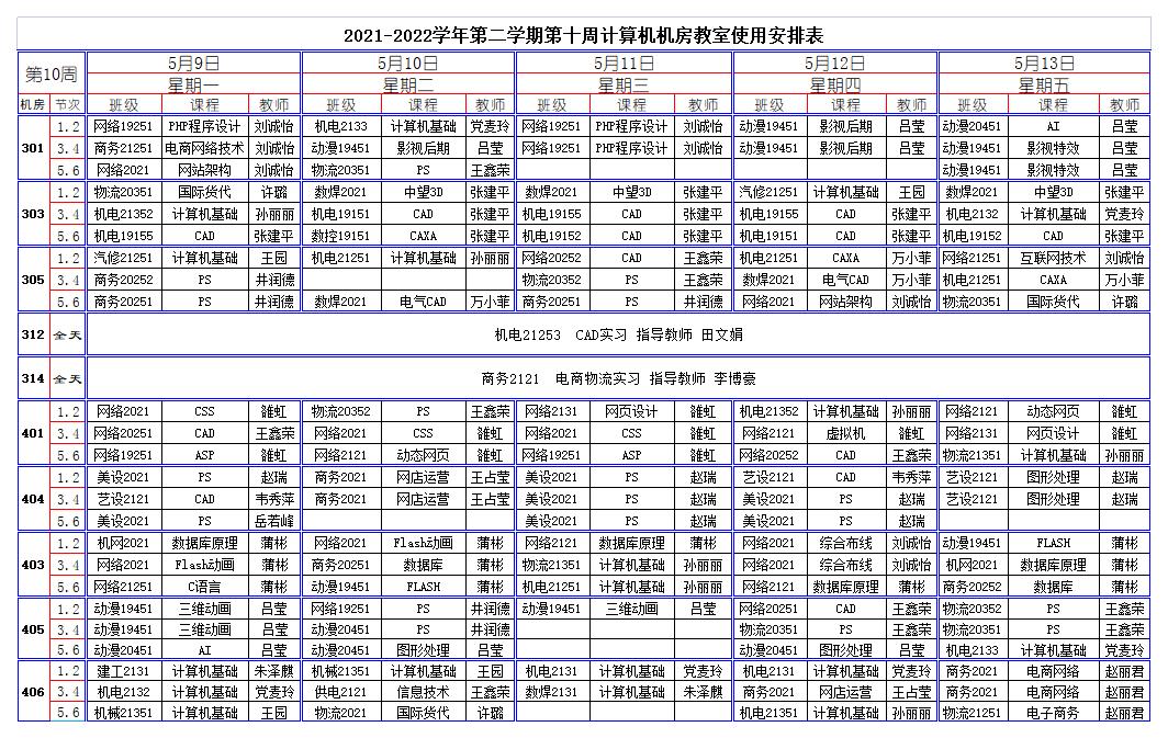 2021-2022學年第二學期第10周計算機機房教室使用安排表