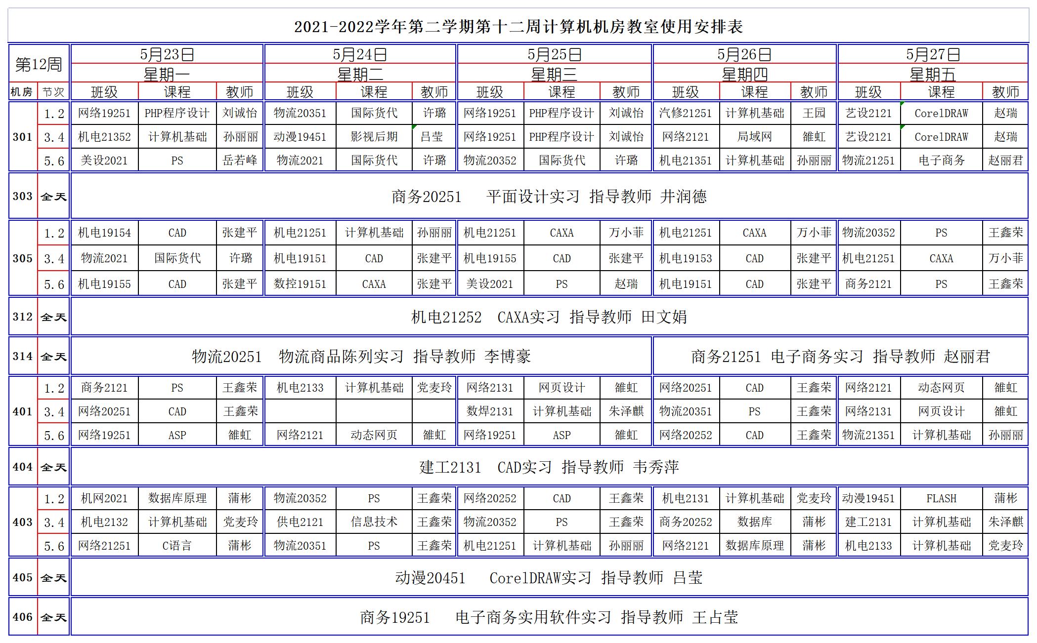 2021-2022學年第二學期第12周計算機機房教室使用安排表